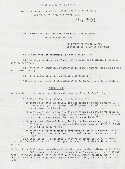 Dans le Pas-de-Calais, les distances d’implantation des ruches sont fixées par un arrêté préfectoral daté de mai 1992.